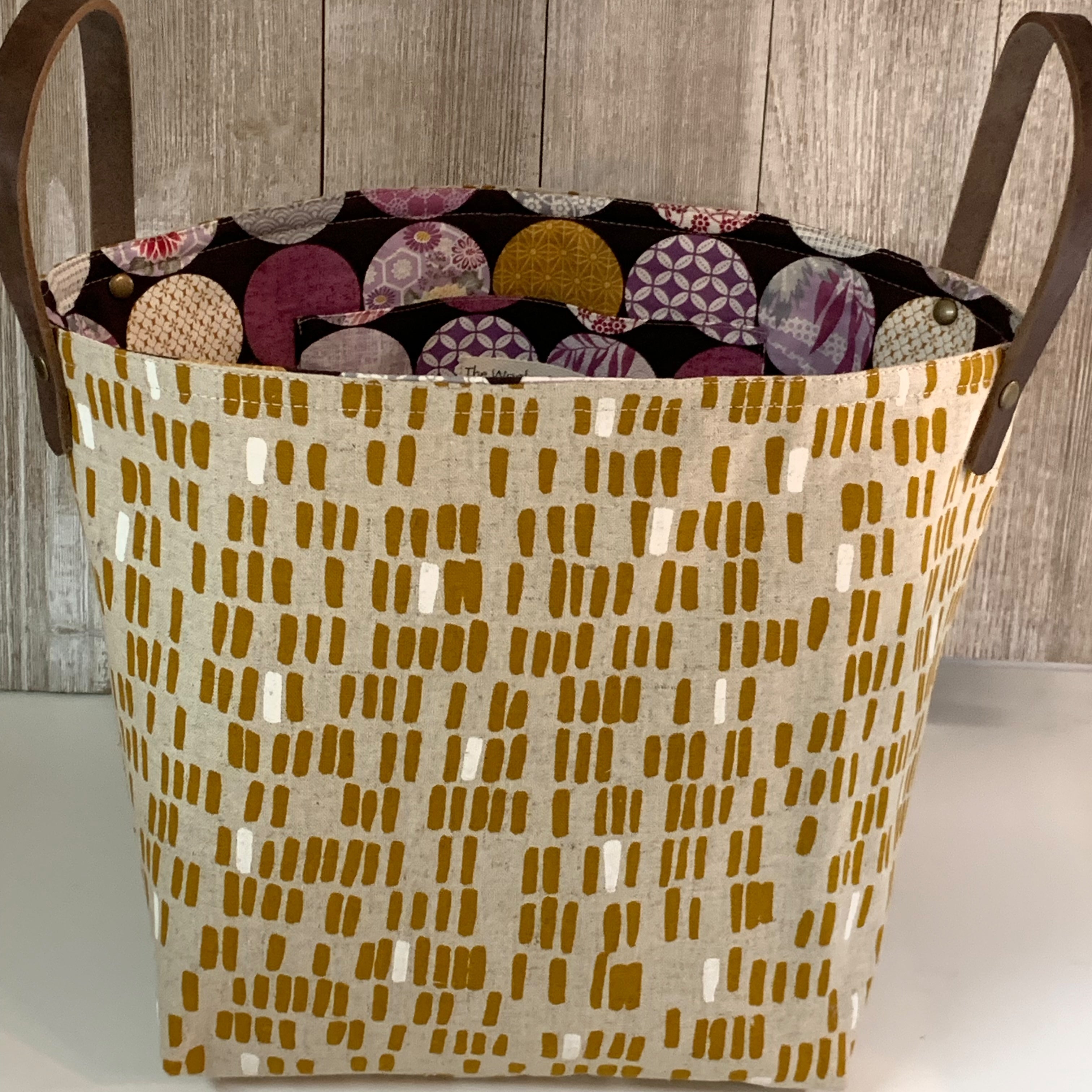 Big enough to carry a few smaller project bags or bigger items like sweaters.Made from high quality sturdy canvas blends and lined with beautiful coordinating fabrics. Leather handles and an inside pocket all add up to a great knitting bag is easy to grab on the go! -